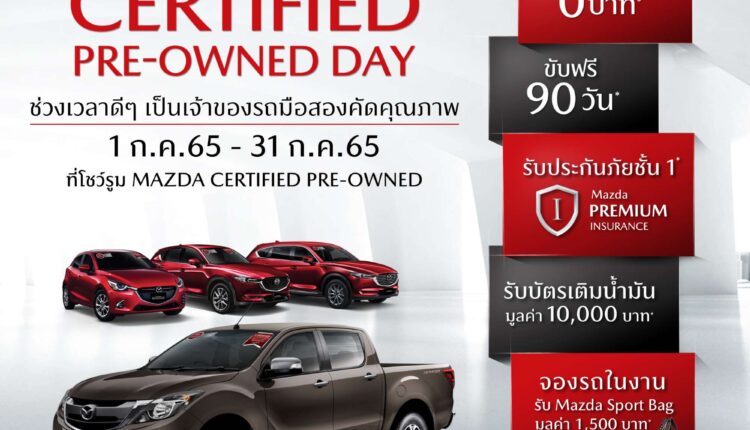 นอกจากจะมุ่งมั่นดูแลลูกค้ารายใหม่ที่กำลังจะเข้าสู่ครอบครัวมาสด้าแล้ว มาสด้ายังเอาใจใส่ดูแลลูกค้าเก่าอย่างใกล้ชิด เพื่อให้ลูกค้ามีทางเลือกที่ดีกว่า โดยลูกค้าที่ใช้รถยนต์มาสด้าอยู่แล้วสามารถนำรถมาเทรดอินกับรถใหม่ป้ายแดงหรือรถมือสองคุณภาพดี ที่ผ่านการรับรองมาตรฐานด้วยการตรวจสอบคุณภาพกว่า 119 จุด ภายใต้โครงการ MAZDA CERTIFIED PRE-OWNED กับแคมเปญ MAZDA CERTIFIED PRE-OWNED DAY ช่วงเวลาดีๆ เป็นเจ้าของรถมือสองคัดสรรคุณภาพที่ดีที่สุด มาพร้อมข้อเสนอออกรถเพียง 0 บาท*, ขับฟรี 90 วัน*, รับประกันภัยชั้น 1 Mazda Premium Insurance*, รับบัตรเติมน้ำมัน มูลค่า 10,000 บาท* และพิเศษจองรถในงานฯ รับ Mazda Sport Bag มูลค่า 1,500 บาท* ระหว่างวันที่ 1-31 ก.ค. 65 ที่โชว์รูม MAZDA CERTIFIED PRE-OWNED ทั่วประเทศ