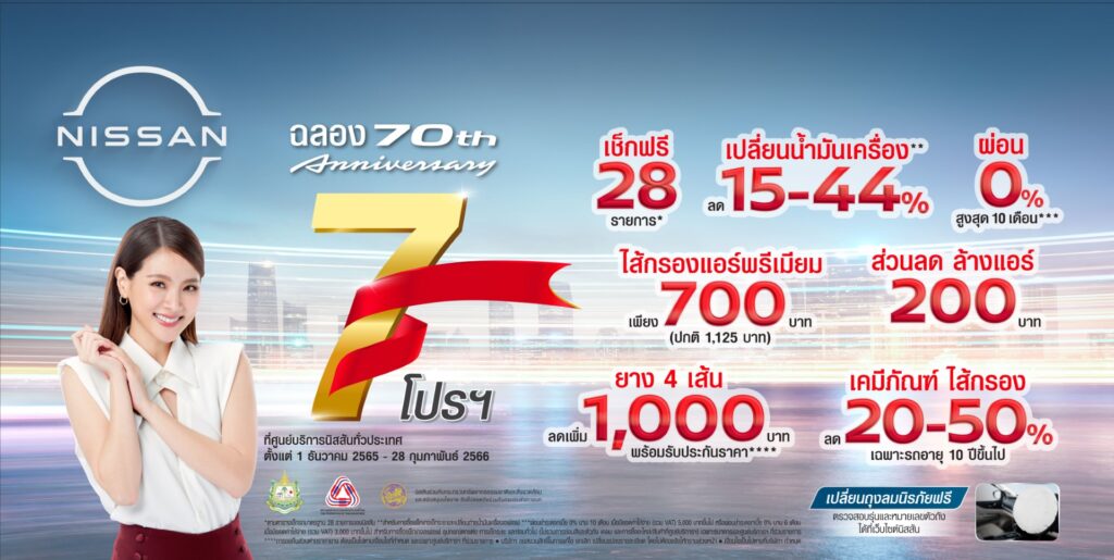 เพื่อร่วมฉลอง 70 ปีของนิสสันในประเทศไทย นิสสันได้มอบแพ็คเกจพิเศษสำหรับบริการหลังการขาย เพื่อช่วยเพิ่มความอุ่นใจและความพึงพอใจให้แก่ลูกค้า ข้อเสนอพิเศษนี้จะเริ่มตั้งแต่เดือนธันวาคม 2565 ไปจนถึงกุมภาพันธ์ 2566 เพื่อช่วยให้ลูกค้ามั่นใจและอุ่นใจตลอดการเดินทางในช่วงเทศกาล โดยลูกค้าสามารถนำรถเข้าเช็คระยะฟรี 28 รายการ ล้างรถ ดูดฝุ่น พร้อมรับส่วนลด 1,000 บาทเมื่อเปลี่ยนยาง 4 เส้นในราคาพิเศษ