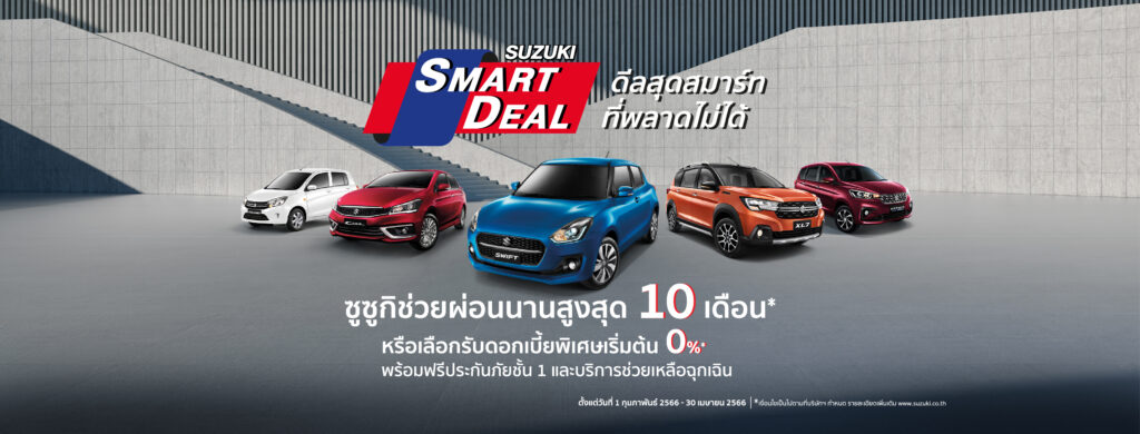 สำหรับแคมเปญ “SUZUKI SMART DEAL ดีลสุดสมาร์ทที่พลาดไม่ได้” จะมอบให้สำหรับลูกค้าที่จองและรับรถยนต์ซูซูกิทุกรุ่นที่ตอบโจทย์ผู้บริโภคด้านความคุ้มค่า คุ้มราคา ภายในวัน ที่ 1 กุมภาพันธ์ – 30 เมษายน 2566 ซึ่งประกอบไปด้วยรายละเอียดของแต่ละรุ่น ดังนี้
