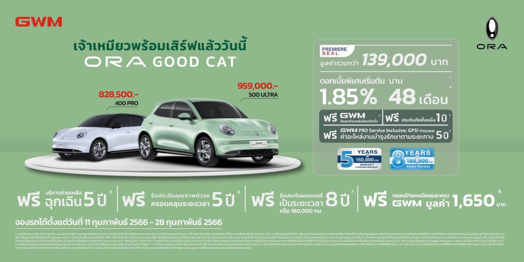 ปิดท้ายด้วยเซอร์ไพรส์แฟนๆ ชาวไทยชุดใหญ่กับการเปิดจอง ORA Good Cat เจ้าเหมียวไฟฟ้า 100% ขวัญใจมหาชนตลอดกาลอีกครั้ง กลับมาครั้งนี้ เจ้าเหมียวไฟฟ้าเปิดให้จองทั้งหมด 2 รุ่น ได้แก่ ORA Good Cat 400 PRO ราคา 828,500 บาท และ ORA Good Cat 500 ULTRA ราคา 959,000 บาท (ราคาหลังหักส่วนลดตามนโยบายสนับสนุนรถไฟฟ้าตามมาตรการรัฐและภาษีสรรพสามิต) นอกจากนี้ ผู้สั่งจองจะได้รับสิทธิประโยชน์มากมายภายใต้แคมเปญ PREMIERE DEAL อาทิ ดอกเบี้ยพิเศษ ฟรี GWM โฮมชาร์จเจอร์พร้อมติดตั้ง ฟรีประกันภัยรถยนต์ชั้น 1 รวมไปถึงค่าอะไหล่และค่าแรงบำรุงรักษาตามระยะทาง 5 ปี หรือ 75,000 กิโลเมตร บริการช่วยเหลือฉุกเฉิน 5 ปี การรับประกันคุณภาพรถใหม่ครอบคลุมระยะเวลา 5 ปี หรือระยะทาง 150,000 กิโลเมตร และการรับประกันแบตเตอรี่ EV เป็นระยะเวลา 8 ปี หรือ 180,000 กิโลเมตร