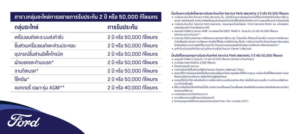 ฟอร์ดเดินหน้าเน้นย้ำการยกระดับประสบการณ์การเป็นเจ้าของรถยนต์ฟอร์ด พร้อมเสริมความมั่นใจให้แก่ลูกค้าผ่านโปรแกรมการขยายการรับประกันอะไหล่ที่ยาวนานขึ้นจากเดิม 1 ปี หรือ 20,000 กิโลเมตร เป็น 2 ปี หรือ 50,000 กิโลเมตร แล้วแต่ระยะใดจะถึงก่อน เมื่อลูกค้านำรถยนต์ฟอร์ดเข้ารับบริการเปลี่ยนอะไหล่แท้ฟอร์ด หรือฟอร์ดมอเตอร์คราฟท์ ซึ่งครอบคลุม 5 กลุ่มอะไหล่หลัก ประกอบด้วย 1. เครื่องยนต์และระบบส่งกำลัง 2. ชิ้นส่วนเครื่องยนต์และส่วนประกอบ 3. อุปกรณ์ชิ้นส่วนอิเล็กทรอนิกส์ 4. กลุ่มอะไหล่บำรุงรักษา และการสึกหรอตามสภาพการใช้งาน ได้แก่ ผ้าเบรคและก้ามเบรค จานดิสเบรค และโช้คอัพ และ 5. แบตเตอรี่ เฉพาะรุ่น AGM โดยแบตเตอรี่ FoMoCo ประเภท AGM หมายเลขอะไหล่ EB3Z 10655 A จะขยายระยะรับประกันเป็น 2 ปี หรือ 40,000 กิโลเมตร แล้วแต่ระยะใดจะถึงก่อน