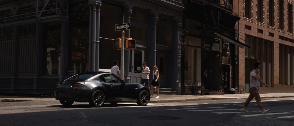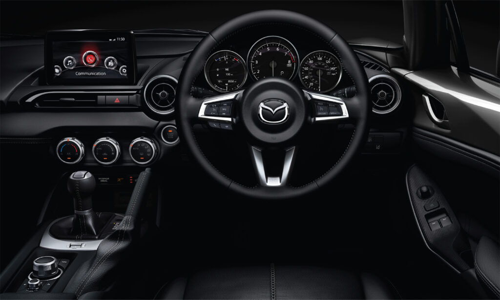 New Mazda MX-5 ยังคงเอกลักษณ์ความสง่างามโฉบเฉี่ยว ด้วยล้ออัลลอยขนาด 17 นิ้ว สีดำเมทัลลิค และคิ้วบันไดกันรอยสเตนเลส พรั่งพร้อมด้วยเทคโนโลยีความสะดวกสบายและความปลอดภัย อาทิ หลังคาแข็งที่สามารถเปิด-ปิดด้วยระบบไฟฟ้า เทคโนโลยีไฟหน้าแบบ LED Projector และไฟส่องสว่างสำหรับการขับขี่เวลากลางวัน Daytime Running Lamp ภายในห้องโดยสารเลือกใช้เฉพาะวัสดุคุณภาพสูงและประณีตทุกจุดสัมผัส ไม่ว่าจะเป็น เบาะหนัง Perforated และเดินตะเข็บด้วยด้ายเย็บสีเทา พร้อมรองรับการใช้งาน Apple CarPlay® และ Mazda Connect โดยแสดงข้อมูลผ่านหน้าจอสี Center Display ขนาด 7 นิ้ว พร้อมมอบสุนทรียภาพในการขับขี่ด้วยระบบเสียงคุณภาพ Bose® รอบทิศทาง พร้อมลำโพงถึง 9 ตำแหน่ง