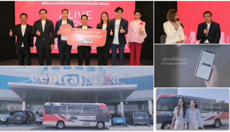 ถือเป็นก้าวสำคัญในการสร้างประสบการณ์ดีๆ ให้กับสังคมเมือง สามารถเช็คตารางการเดินมางของรถบัส และการจองรถจากสถานีรถไฟฟ้า BTS-อุดมสุข และ BTS-บางนา ไปยังห้างสรรพสินค้าเซ็นทรัล บางนา ได้ทุกวันโดยไม่เสียค่าบริการ เสริมด้วยระบบ GPS ที่ผูกกับแอปพลิเคชัน เพื่ออำนวยความสะดวกให้กับทุกคนด้วยความสามารถตรวจสอบตำแหน่งของรถบัสได้แบบ Real Time สนับสนุนให้ผู้คนสามารถเดินทางใช้ชีวิตได้อย่างมีความสุข โดยโตโยต้าได้จับมือกับ Central Pattana เครือข่ายห้างสรรพสินค้าชั้นนำของไทย ในมอบประสบการณ์ความสุขสำหรับทุกไลฟ์สไตล์ พร้อมส่วนลดจากร้านอาหารชื่อดังในเครือ Central Restaurant Group (CRG) ทั้ง Ootoya, Katsuya, Pepper Lunch, Chabuton, Yoshinoya, Tenya และร้านอาหารอื่นๆ ในห้างสรรพสินค้า ซึ่งทุกคนสามารถดาวน์โหลดแอปพลิเคชัน และรับส่วนลดได้ทันที พร้อมแผนการจัดงานต่างๆ ที่น่าสนใจตลอดปีนี้ซึ่ง ALIVE MOVE สามารถช่วยลดปัญหาที่จอดรถ และเสริมความสะดวกในการเดินทางได้อย่างมาก