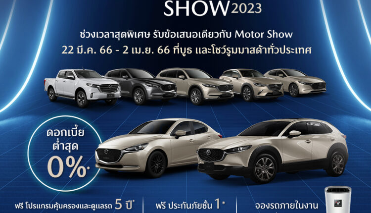 ด้วยเหตุนี้ สำหรับในประเทศไทย มาสด้าจึงได้นำเทคโนโนโลยีมาจัดแสดงในงานมอเตอร์ โชว์ 2023 เพื่อแสดงออกถึงแนวทางในการก้าวสู่อนาคต มาสด้าเรียนเชิญชวนลูกค้าและแฟนๆ ทุกท่าน เข้ามายลโฉมกันที่บูธมาสด้าได้ตั้งแต่วันที่ 22 มี.ค. 66 – 2 เม.ย. 66 หรือเพียง 12 วัน เท่านั้น และนอกจากรถไฟฟ้าที่นำมาจัดแสดงแล้ว มาสด้ายังได้นำรถยนต์มาสด้ามาจัดแสดงครบทุกรุ่น ไม่เพียงเท่านี้ สำหรับลูกค้าที่ต้องการเลือกซื้อรถมาสด้าภายในงานฯ รับข้อเสนอสุดคุ้มครั้งเดียวในรอบปี รวมถึงของพรีเมี่ยมสุดพิเศษกับเครื่องฟอกอากาศ SHARP รุ่น FP-F30TA-A มูลค่า 2,990 บาท4 (จำนวนจำกัด) เมื่อจองรถในงานฯ 5,000 บาท และรับรถภายใน 30 เม.ย. 66 โดยข้อเสนอสุดพิเศษภายในงาน มีดังต่อไปนี้