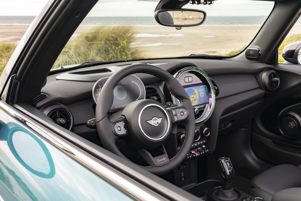 เมื่อก้าวเข้าสู่ภายในตัวรถ จะพบกับแถบสีขาวสองเส้นขนานกันที่บริเวณประตู พร้อมอักษรตกแต่งคำว่า Seaside เบาะนั่งบุด้วยหนังสีดำ Carbon Black มาพร้อมที่วางขาและแขนมอบความสะดวกสบายแบบเต็มขั้น บริเวณแผงคอนโซลด้านหน้ายังตกแต่งด้วยลายเส้น ลวดลายพิมพ์ และตัวอักษรเฉลิมฉลองการครบรอบ บริเวณด้านล่างของพวงมาลัยหุ้มหนัง Nappa ยังสลักด้วยตัวอักษร Seaside ชื่อรุ่นของมินิสุดพิเศษคันนี้ ความเป็นเอกลักษณ์ของรถยนต์มินิรุ่นนี้ยังเห็นได้จากกุญแจของรถยนต์ที่ออกแบบเป็นลายเกลียวคลื่นในสีน้ำเงินแบบเหลือบ สลักตัวอักษร “Seaside”