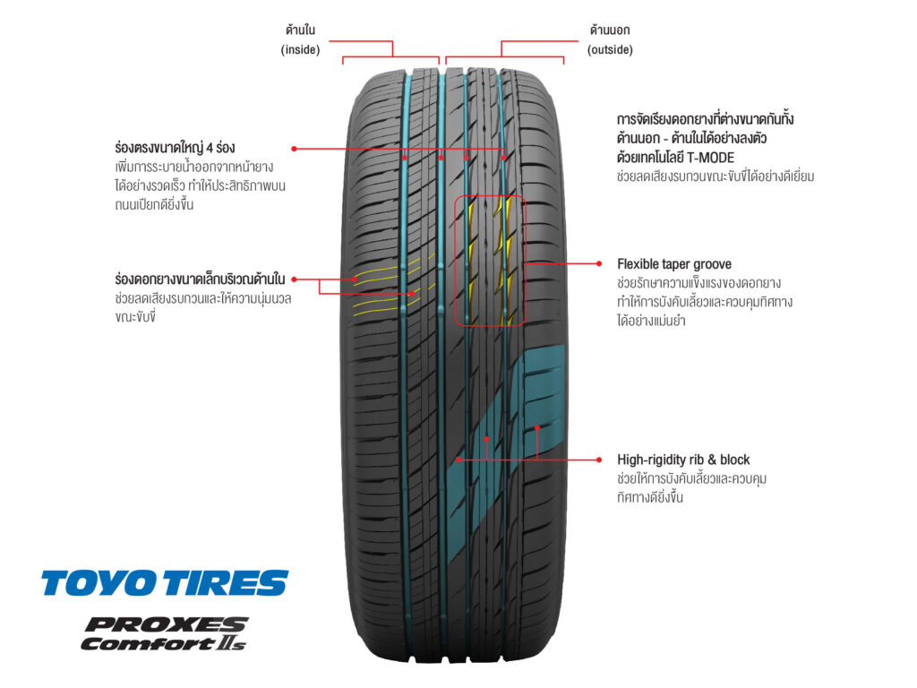 บริษัท ต.สยาม คอมเมอร์เชียล จำกัด ผู้นำเข้าและจัดจำหน่ายยาง Toyo Tires สำหรับประเทศไทย เปิดตัวอีกหนึ่งผลิตภัณฑ์ยางรถยนต์โดยสาร Toyo Proxes Comfort IIs (C2S) ยาง Super Comfort รุ่นใหม่ล่าสุดเพื่อตอบโจทย์ผู้บริโภคในปัจจุบัน ที่ต้องการความนุ่มนวลในการขับขี่พร้อมทั้งเสียงรบกวนจากยางรถยนต์ขณะวิ่งต่ำ แต่ยังคงเปี่ยมด้วยประสิทธิภาพในการยึดเกาะถนนบนทุกสภาพอากาศ ไม่ว่าจะเป็นพื้นถนนแห้งหรือบนพื้นถนนเปียกเปียก อันได้แก่ ยาง Toyo Proxes Comfort IIs (C2S) จากค่าย Toyo Tires ซึ่งเป็นยาง Super Comfort ที่ได้พัฒนาเทคโนโลยีจากการผลิต ทั้งในส่วนของโครงสร้างของยางรูปแบบใหม่ที่ทำให้ช่วยลดความแข็งกระด้างจากพื้นถนนและรอยต่อถนนได้อย่างดีเยี่ยม ทำให้การขับขี่ นุ่มสบาย และการออกแบบจัดเรียงบล็อกดอกยางด้วยเทคโนโลยีใหม่ล่าสุด ช่วยให้ลดเสียงรบกวนจากยางรถยนต์ขณะวิ่งได้อย่างดีเยี่ยม แถมยังช่วยในเรื่องของการยึดเกาะถนนบนพื้นถนนแห้ง พร้อมด้วยร่องระบายน้ำหลัก 4 ร่องขนาดใหญ่บนหน้ายางช่วยเสริมประสิทธิภาพการระบายน้ำออกจากหน้ายางได้อย่างรวดเร็วลดการเหินน้ำ ช่วยให้คุณมั่นใจในการควบคุมแม้บนพื้นถนนที่เปียกและมีน้ำขังในการเดินทาง