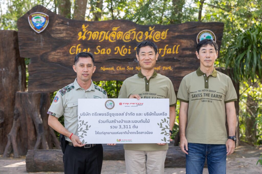 มร. ทาคาชิ ฮาตะ ประธานเจ้าหน้าที่บริหารกลุ่มตรีเพชร และกรรมการผู้จัดการ บริษัท ตรีเพชรอีซูซุเซลส์ จำกัด กล่าวว่า “โครงการ “Tri Petch Group Saves the Earth” ได้ริเริ่มขึ้นเมื่อปี พ.ศ. 2559 เป็นโครงการเพื่อสิ่งแวดล้อมที่คำนึงถึงทั้งด้านฮาร์ดแวร์และซอฟต์แวร์ ผ่านการปรับปรุงระบบพลังงานและทรัพยากรต่าง ๆ ให้เป็นมิตรกับสิ่งแวดล้อม และยังเสริมสร้างความตระหนักรู้ของพนักงานและส่งเสริมวัฒนธรรมเรื่องความยั่งยืน (Sustainability) อาทิ การปรับปรุงและยกระดับอาคารสำนักงานใหญ่ บริษัท ตรีเพชรอีซูซุเซลส์ จำกัด โดยติดตั้งแผงโซล่าเซลล์ ใช้หลอดไฟ LED มีระบบบริหารจัดการและควบคุมอาคารอัตโนมัติ ใช้แผ่นกรองอากาศประสิทธิภาพสูง และติดตั้งหลอด UV-C ในระบบปรับอากาศ ผ่านเกณฑ์มาตรฐานด้านการใช้พลังงานและด้านคุณภาพอากาศภายในอาคาร จนได้รับรางวัลอันทรงคุณค่ามากมายทั้งในระดับประเทศและระดับภูมิภาคอาเซียน การให้พนักงานทุกคนร่วมปรับปรุงกระบวนการทำงานอย่างต่อเนื่องให้สอดคล้องกับการเปลี่ยนแปลงทางดิจิทัล (Digital Transformation) และการเปลี่ยนแปลงการดำเนินงาน (Operational Transformation) เพื่อนำไปสู่การบริหารจัดการอย่างยั่งยืน รวมถึง การขยายโครงการสู่สังคมและชุมชน ผ่านการเชิญชวนให้พนักงานบริจาคสิ่งของเพื่อนำไปให้มูลนิธิหรือองค์กรต่างๆ และในปีนี้ เราได้จัดกิจกรรมเพื่อสิ่งแวดล้อมขึ้นที่ อุทยานแห่งชาติน้ำตกเจ็ดสาวน้อย อำเภอมวกเหล็ก จังหวัดสระบุรี โดยมีผู้บริหารและพนักงานกลุ่มตรีเพชรกว่า 120 คน ร่วมกันปลูกต้นไม้และยิงเมล็ดพันธุ์ปลูกป่าจำนวนเท่ากับพนักงานในกลุ่มตรีเพชร คือ 3,311 ต้น ซึ่งสามารถช่วยลดก๊าซคาร์บอนไดออกไซด์ 39,732 กิโลกรัม Co2/ ปี และทำฝายชะลอน้ำเพื่อกักเก็บน้ำในหน้าแล้ง ลดการพังทลายของหน้าดิน เราเชื่อมั่นว่าจากกิจกรรมต่างๆ รวมถึงการรณรงค์ให้พนักงานมีจิตสำนึกด้านการอนุรักษ์พลังงานและสิ่งแวดล้อม ได้สะท้อนให้เห็นถึงความตั้งใจอันแน่วแน่ และเราจะยังคงดำเนินต่อและทำให้กิจกรรมเหล่านี้แข็งแกร่งยิ่งขึ้น เพื่อสร้างสังคมที่ยั่งยืนสำหรับคนรุ่นต่อไป”