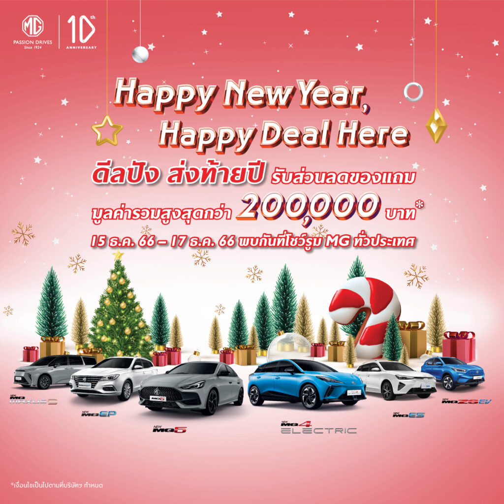 แม้ว่างาน MOTOR EXPO 2023 จะสิ้นสุดลง แต่ เอ็มจี ยังขยายเวลามอบข้อเสนอพิเศษเพื่อให้ลูกค้าทั่วประเทศได้เป็นเจ้าของรถใหม่ป้ายแดงได้อย่างคุ้มค่าที่สุด ซึ่งเอ็มจีมีรถยนต์ให้เลือกหลากหลายเซ็กเมนต์ ครบทุกขุมพลังขับเคลื่อน ตอบโจทย์การใช้งานได้หลากหลายรูปแบบ จึงผนึกกำลังกับผู้จำหน่ายทั่วประเทศจัดกิจกรรม “HAPPY NEW YEAR, HAPPY DEAL HERE” ในทุกโชว์รูมกว่า 150 แห่ง ทั่วประเทศ ตั้งแต่ 15 ธันวาคม 2566 ถึง วันที่ 17 ธันวาคม 2566 (3 วัน) โดยลูกค้าสามารถเปิดประสบการณ์การทดลองขับขี่ พร้อมรับสิทธิพิเศษมูลค่ารวมสูงสุด 200,000 บาท อีกทั้งสามารถเลือกดาวน์เริ่มต้น 8% หรือเลือกรับดอกเบี้ยพิเศษ 1.88% พร้อมฟรี! ประกันภัยชั้น 1 และ พ.ร.บ. คุ้มครองนานสูงสุดถึง 2 ปี ซึ่งเป็นข้อเสนอเดียวกับ MOTOR EXPO 2023 ถึง 31 ธันวาคม 2566