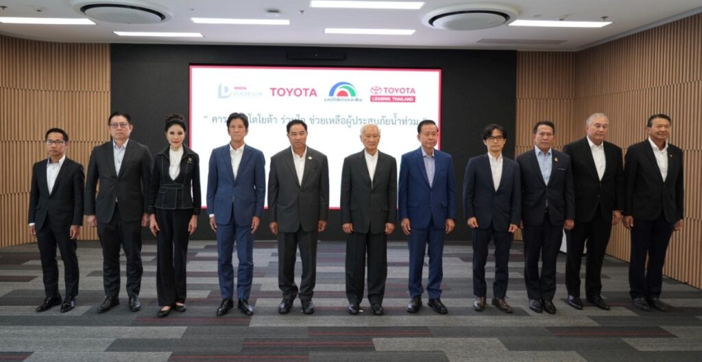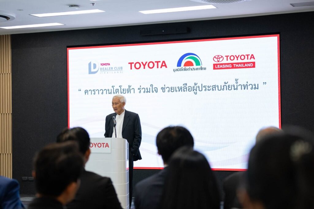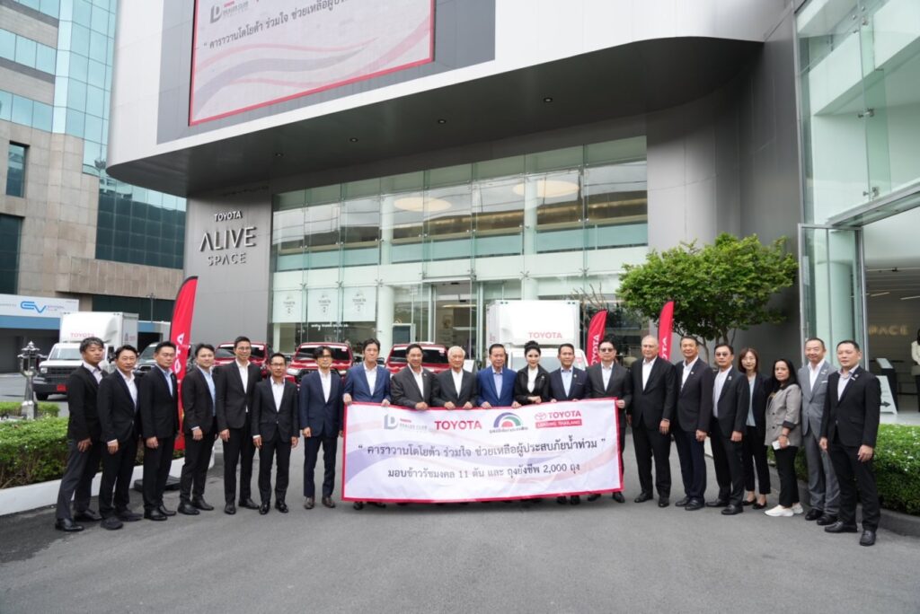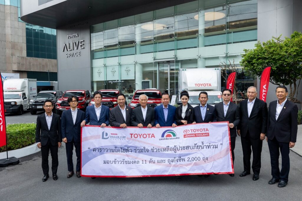 มูลนิธิโตโยต้าประเทศไทย บริษัท โตโยต้า มอเตอร์ ประเทศไทย จำกัด ชมรมผู้แทนจำหน่ายโตโยต้า ทั่วประเทศ และบริษัท โตโยต้า ลีสซิ่ง (ประเทศไทย) จำกัด มีความห่วงใยและตั้งใจในการร่วมช่วยเหลือคนไทย ให้ก้าวผ่านวิกฤติครั้งนี้ไปด้วยกันโดยเร็วที่สุด จึงได้ร่วมมือกันสนับสนุนถุงยังชีพ จำนวน 2,000 ชุด ข้าวรัชมงคล 11 ตัน และสุขากระดาษจากมูลนิธิเอสซีจี (SCG Foundation) จำนวน 300 ชุด เพื่อนำไปแจกจ่ายให้กับประชาชนที่เดือดร้อนในแต่ละพื้นที่ และชุมชนที่อยู่บริเวณใกล้เคียงกับผู้แทนจำหน่ายฯ ตลอดจนส่งรถกระบะโตโยต้า ไฮลักซ์ รีโว่ และไฮลักซ์ แชมป์ จำนวนรวม 7 คัน เพื่อสนับสนุนการปฏิบัติภารกิจของเจ้าหน้าที่ในพื้นที่